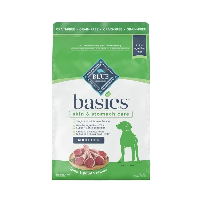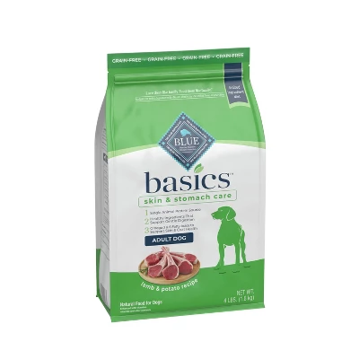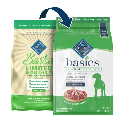 - Contains (1) 4lb bag of BLUE Basics Limited Ingredient Diet, Grain Free Natural Adult Dry Dog Food, Lamb & Potato