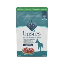 - PACKAGING MAY VARY: Contains one (1) 22lb bag of BLUE Basics Skin & Stomach Care, Grain Free Natural Adult Large Breed Dry Dog Food, Lamb & Potato