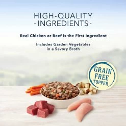 - Special grain-free recipe features meaty morsels of real chicken or beef in a savory broth with garden veggies.