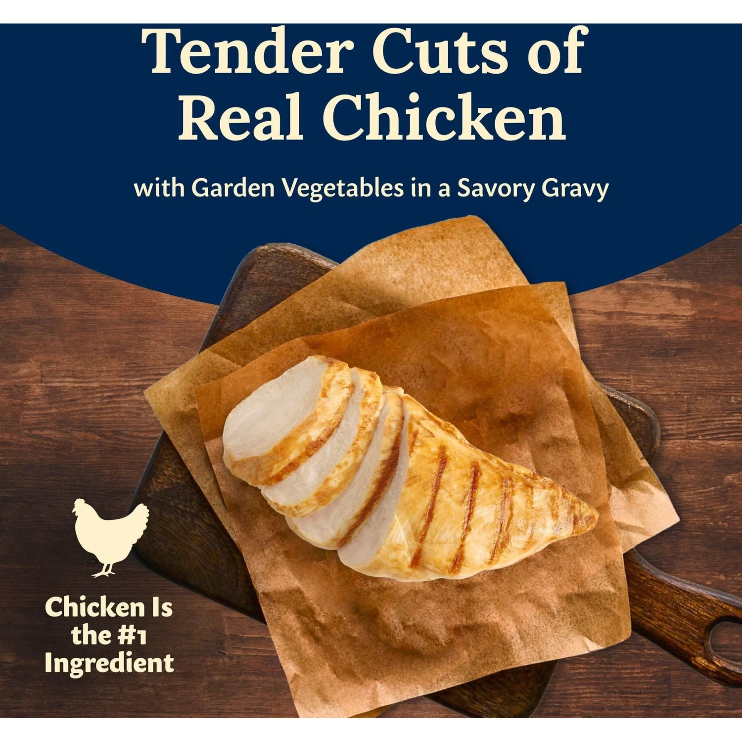 - Grain free wet dog food features meaty morsels of real chicken in a savory broth with garden veggies.