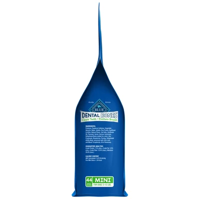 • Contains one (1) 12-oz bag of BLUE Dental Bones Natural Adult Dental Chew Dog Treat, Mini