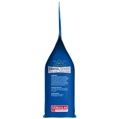 - Contains (1) 12-oz bag of BLUE Dental Bones Natural Adult Dental Chew Dog Treat, Regular