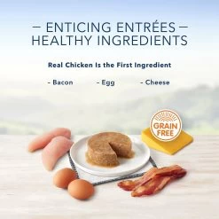 - Every pack comes with 12 cups of grain-free Bacon, Egg & Cheese Pate with real chicken first to help fuel your little furry friend’s muscles and support his higher energy needs.