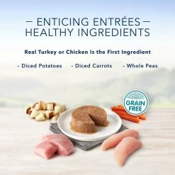 - Crafted with real turkey or chicken first and other recognizable ingredients including peas, carrots and potatoes in a savory gravy.