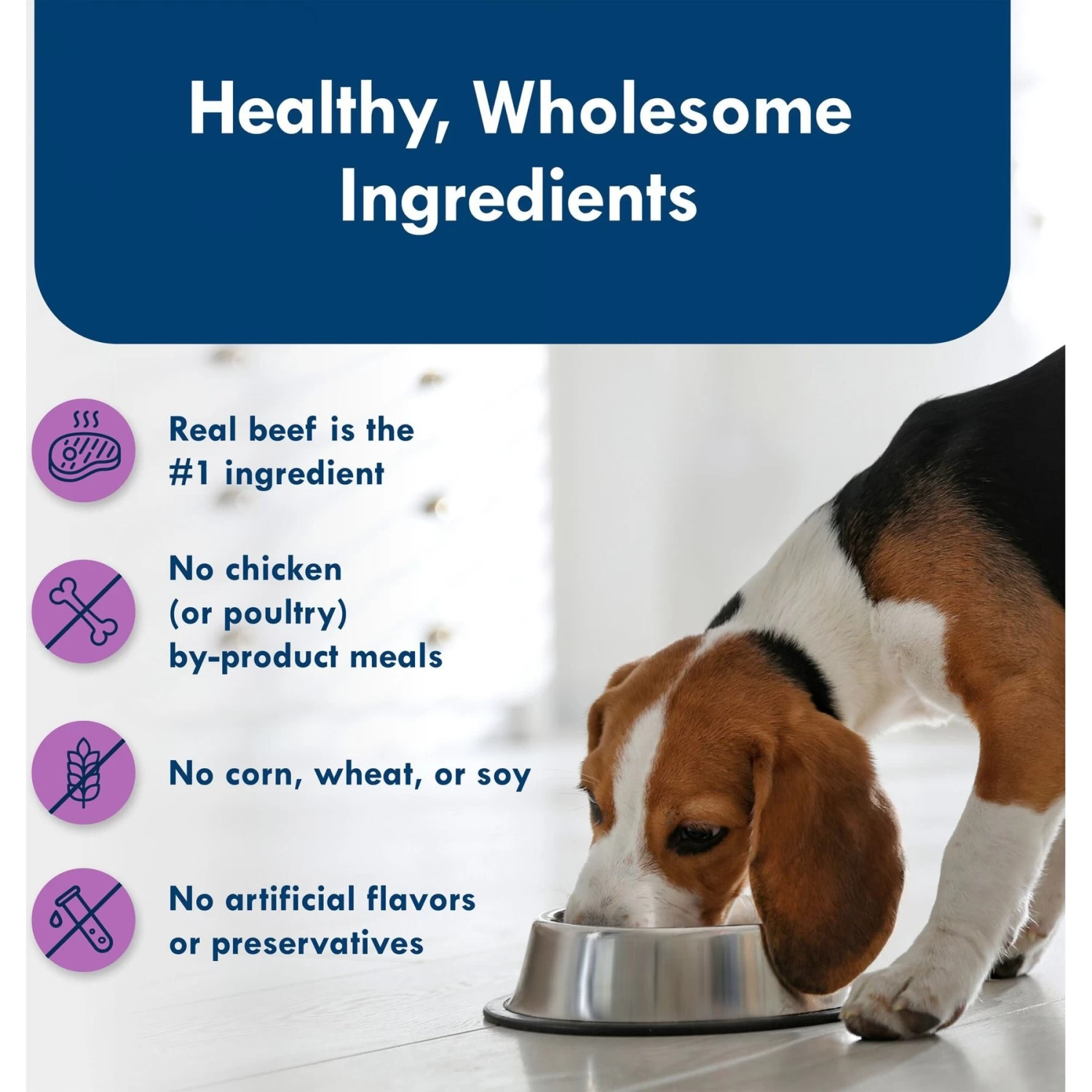 - Completely free from poultry by-product meals, corn, wheat, soy, and artificial flavors and preservatives.