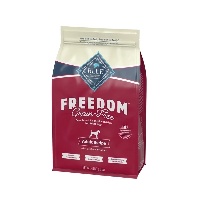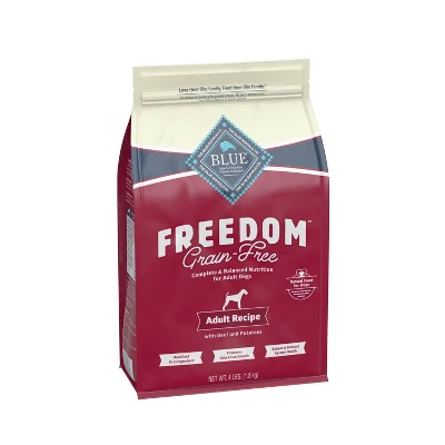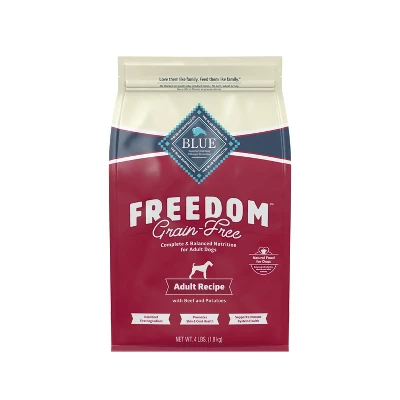 - Contains (1) 4lb bag of BLUE Freedom Grain Free Natural Adult Dry Dog Food, Beef