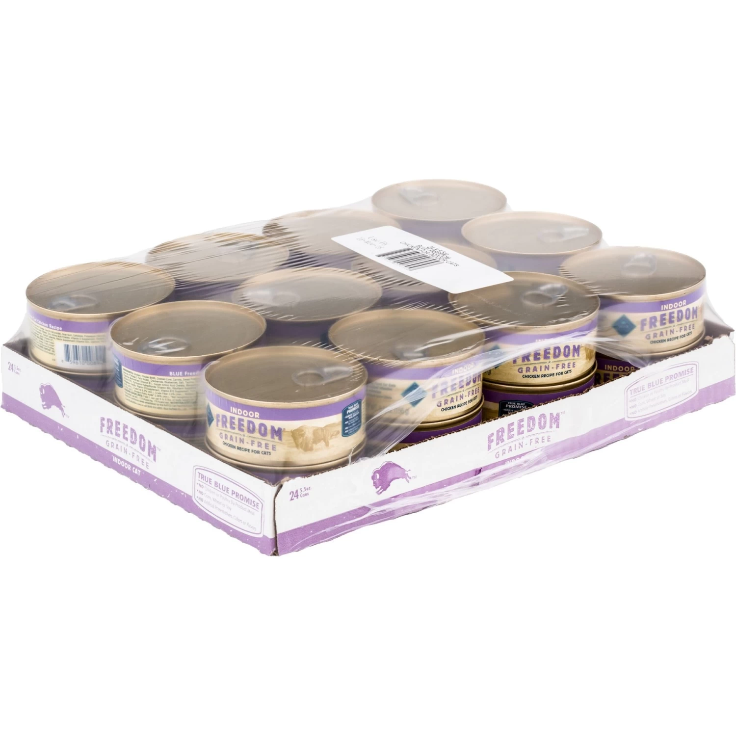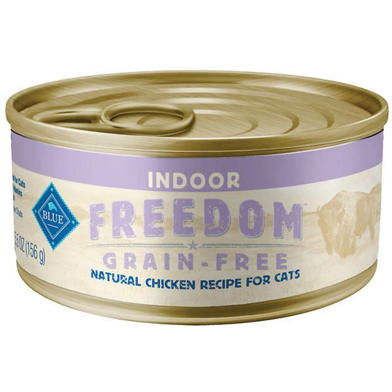 Blue Buffalo Freedom Indoor Adult Chicken Recipe Grain-Free Canned Cat Food, 5.5-oz, case of 24—Help keep your cat compadre feeling happy and healthy with Blue Buffalo Freedom Grain Free Natural Adult Pate Wet Cat Food. Purr-fect for your grown-up gal, this irresistibly tasty wet food is made using only the finest naturally grain and gluten-free ingredients. It starts with high-protein chicken, packed with healthy fruits and veggies, then enhanced with vitamins and minerals. Formulated to support the nutritional needs of adult cats, this delicious pate-style food is made exclusively with wholesome ingredients that do not contain any grain, gluten, by-product meals, corn, wheat, soy, artificial flavors or preservatives.