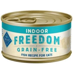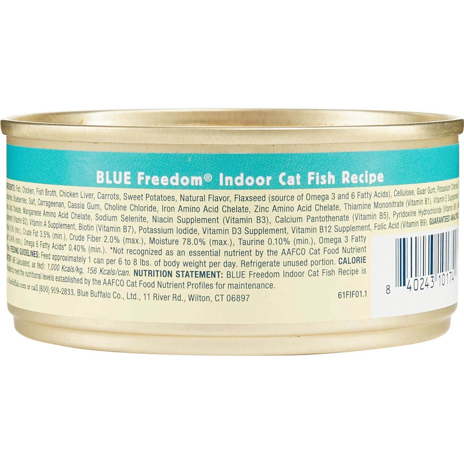Blue Buffalo Freedom Indoor Adult Fish Recipe Grain-Free Canned Cat Food, 5.5-oz, case of 24—Feed your feline friend the flavorful fish she loves with Blue Buffalo Freedom Grain Free Natural Adult Pate Wet Cat Food. Purr-fect for your grown-up gal, this irresistibly tasty wet food is made using only the finest naturally grain and gluten-free ingredients. It starts with high-protein fish, packed with healthy fruits and veggies, then enhanced with vitamins and minerals. Formulated to support the nutritional needs of adult cats, this delicious pate-style food is made exclusively with wholesome ingredients that do not contain any grain, gluten, by-product meals, corn, wheat, soy, artificial flavors or preservatives.