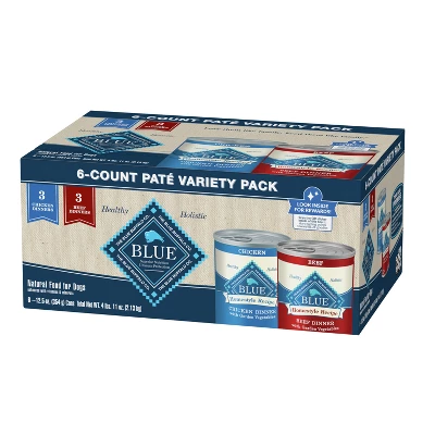 - NEW PACK SIZE: Contains one (1) variety pack of Blue Homestyle Recipe Adult Wet Dog Food, Chicken & Beef Pate 12.5-oz cans (6 count- 3 of each flavor)