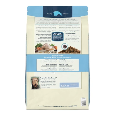 Because puppyhood is such an important stage in any dog’s life, BLUE Life Protection Formula Chicken and Brown Rice Puppy dry dog food is specially made to support the healthy growth and development of your puppy. It’s a high-quality, balanced recipe you can both feel great about. With real chicken first in a lineup of natural ingredients enhanced with vitamins, minerals, and other nutrients, this recipe is as delicious as it is healthy for your new best friend. Formulated specifically for puppies, this diet contains DHA and ARA — fatty acids found in mother’s milk — plus Choline, to support brain and eye development. Like all BLUE dry foods, BLUE Life Protection Formula includes exclusive antioxidant-rich LifeSource Bits, which are “cold-formed” to retain their potency.Give your puppy the balanced nutrition of BLUE Life Protection Formula today.BLUE Life Protection Formula is brought to you by Blue Buffalo, the leader in natural pet food. Blue Buffalo makes premium-quality pet foods featuring real meat, fruit, and vegetables. Love them like family. Feed them like family.