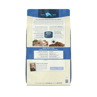Formulated for the health and well-being of adult dogs, BLUE Life Protection Formula Chicken and Brown Rice dry dog food is made with the finest natural ingredients enhanced with vitamins, minerals, and other nutrients. It’s a high-quality, balanced recipe you can both feel great about. Designed to help your dog thrive, this formula starts with real chicken and contains no chicken (or poultry) by-product meals, no corn, wheat, or soy, and no artificial flavors or preservatives. Like all BLUE dry foods, BLUE Life Protection Formula includes exclusive, antioxidant-rich LifeSource Bits to support a healthy immune system in your adult dog.  Give your dog the balanced nutrition of BLUE Life Protection Formula today.BLUE Life Protection Formula is brought to you by Blue Buffalo, the leader in natural pet food. Blue Buffalo makes premium-quality pet foods featuring real meat, fruit, and vegetables. Love them like family. Feed them like family.