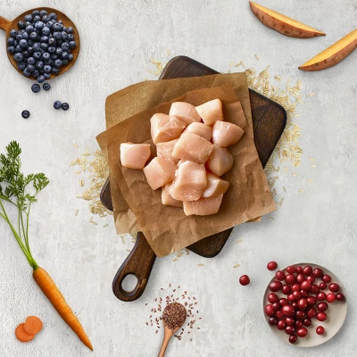 - REAL MEAT FIRST: Blue Buffalo foods always feature real meat as the first ingredient; High-quality protein from real chicken helps your dog build and maintain healthy muscles; Plus they contain wholesome whole grains, garden veggies and fruit