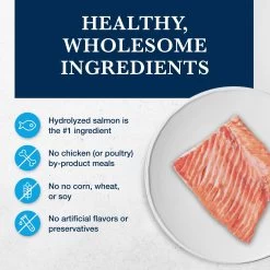 - Formulated to help minimize negative reactions to food with hydrolyzed salmon—a readily digestible source of protein.