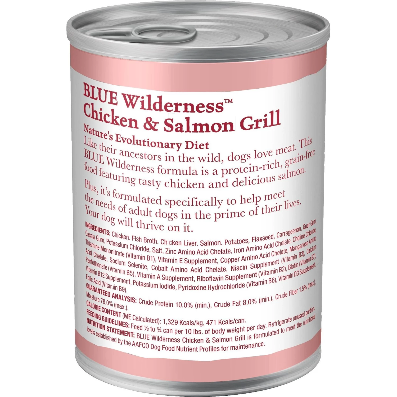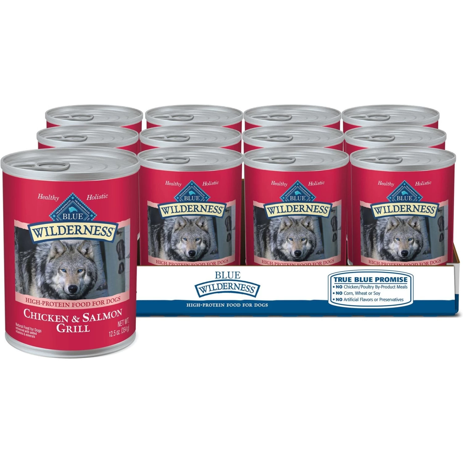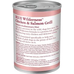 Blue Buffalo Wilderness Salmon & Chicken Grill Grain-Free Canned Dog Food, 12.5-oz, case of 12—Take your best buddy back to nature with Blue Buffalo Wilderness High Protein Grain Free, Natural Adult Wet Dog Food. Paw-fect for your grown-up guy, this irresistibly tasty wet food is made using only the finest naturally grain and gluten-free ingredients. It starts with high-quality protein from grilled pieces of salmon and chicken, packed with fruits and veggies, then enhanced with vitamins and minerals. Formulated to promote an active lifestyle and healthy muscle growth, this high-protein dog food is made with wholesome ingredients that do not contain any grain, gluten, by-product meals, corn, wheat, soy, artificial flavors or preservatives.