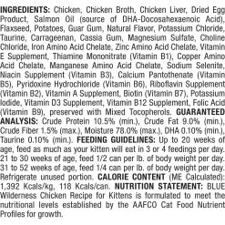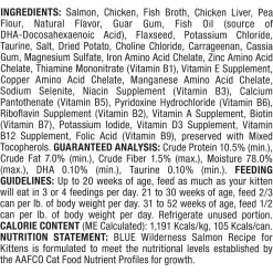 Blue Buffalo Wilderness Kitten Salmon Grain-Free Canned Cat Food, 3-oz, case of 24 — Give your sidekick a supper that she can savor with Blue Buffalo Wilderness High Protein Grain Free, Natural Kitten Pate Wet Cat Food. Purr-fect for your growing kitten, this irresistibly tasty wet food is made using only the finest naturally grain and gluten-free ingredients. It starts with high-protein salmon, packed with healthy fruits and veggies, then enhanced with vitamins and minerals. Formulated with DHA, an important fatty acid found in mother’s milk, this delicious pate-style food helps support your kitty companion’s brain, eye and cognitive development. The exclusively wholesome ingredients do not contain any grain, gluten, by-product meals, corn, wheat, soy, artificial flavors or preservatives.