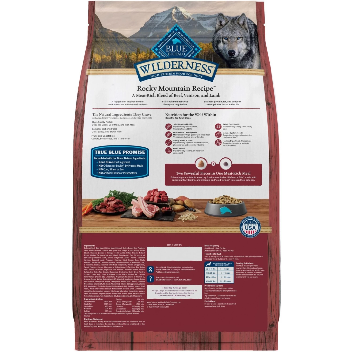 - Recipe inspired by the Rocky Mountains and packed with a blend of red meat to help your large breed furbaby build and maintain lean muscle mass.